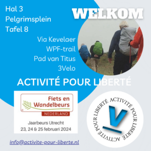 Het verband Activité pour Liberté is in het weekend van 23-25 februari aanwezig geweest op de jaarlijkse Fiets-en wandelbeurs in Utrecht. De vrijwilligers stonden op het Pelgrimsplein in Hal 3. Op het pelgrimsplein was , naast de informatie over de bekende pelgrimages, informatie te vinden over de Via Kevelaer, de WPF-trail, het Pad van Titus en de 3Velo.