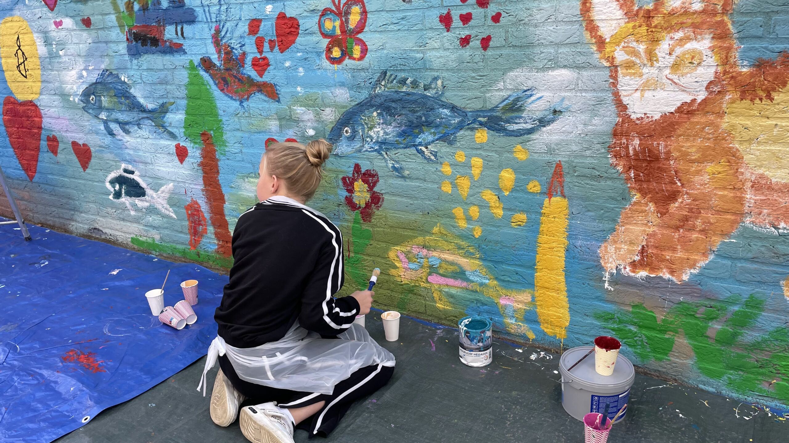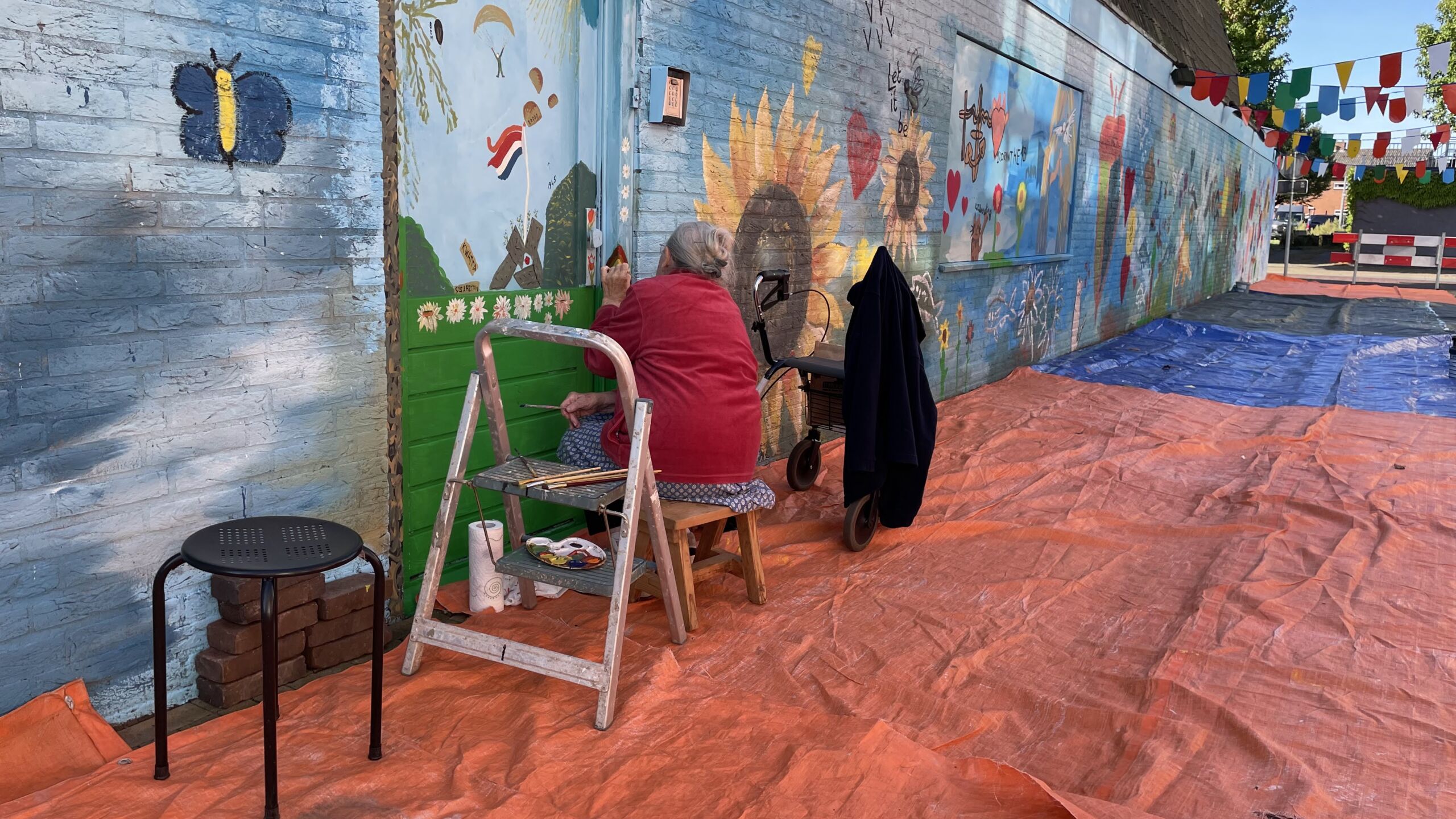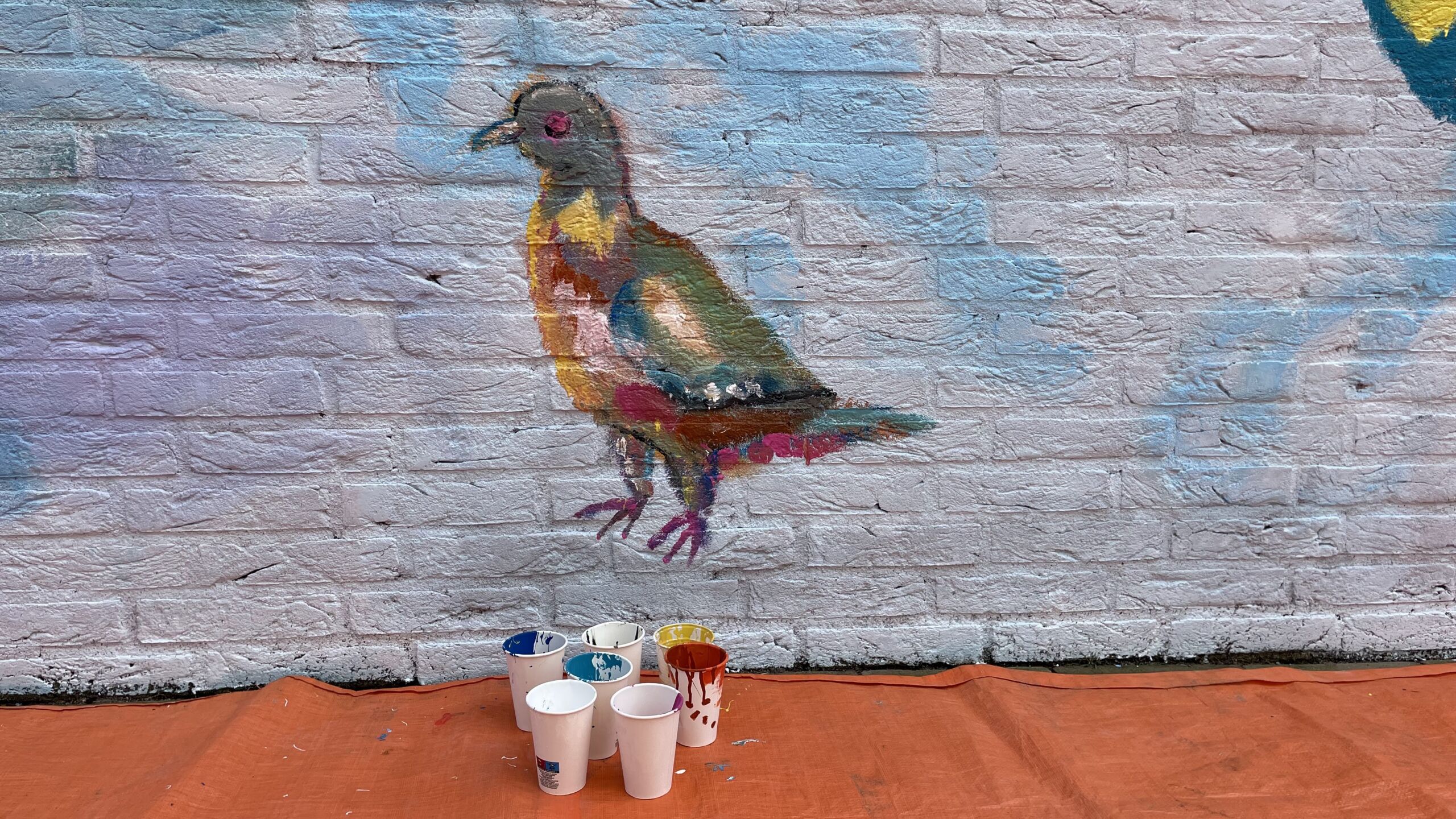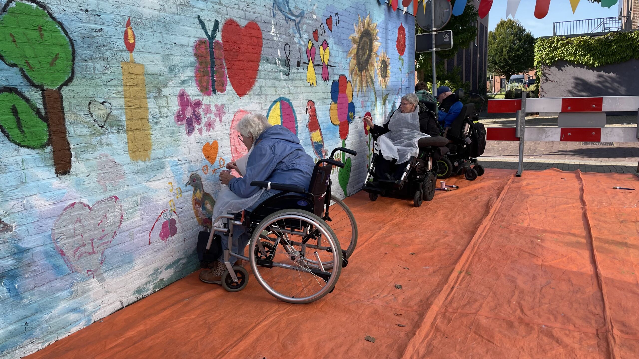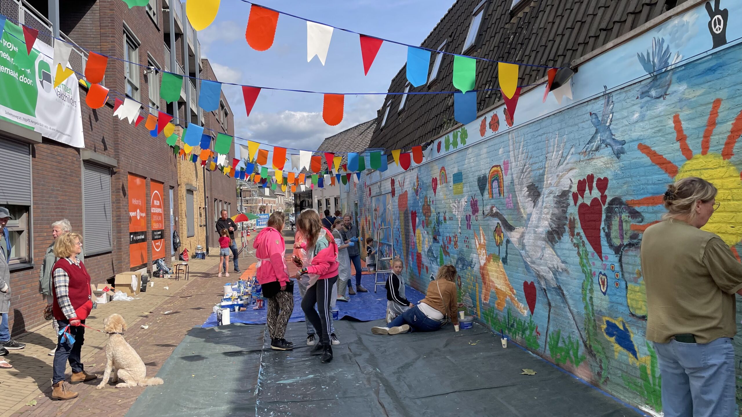 “Als je schildert, ga je uit je hoofd en kom je meer in je hart. Doe je dat samen, dan ontstaan er gesprekken. Ook in deze regio, met best veel verschillende groepen – ook nieuwkomers – is het soms lastig om die verbinding te zoeken met het onbekende. Zo’n muurschildering, samen aan iets werken, dat brengt mensen bij elkaar. Dat merk je hier nu al. Zoveel mensen zijn belangstellend, willen meehelpen of iets voor ons regelen, dat is heel erg mooi.”
