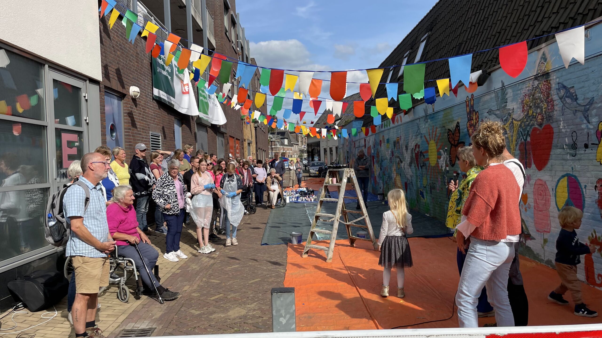 De opening van de kleurrijke muurschildering in de vredeslaan op 14 september door de Burgemeester van Hengelo Gld: Marja van der Tas